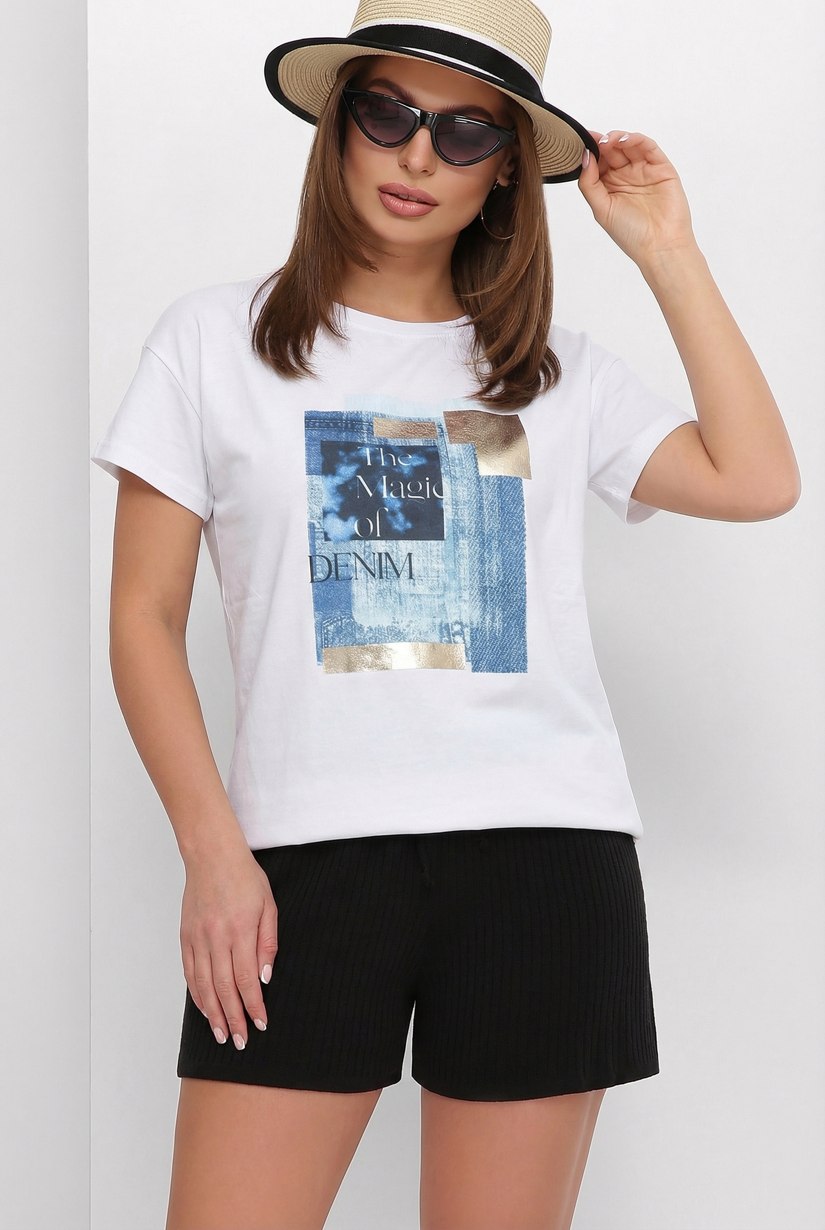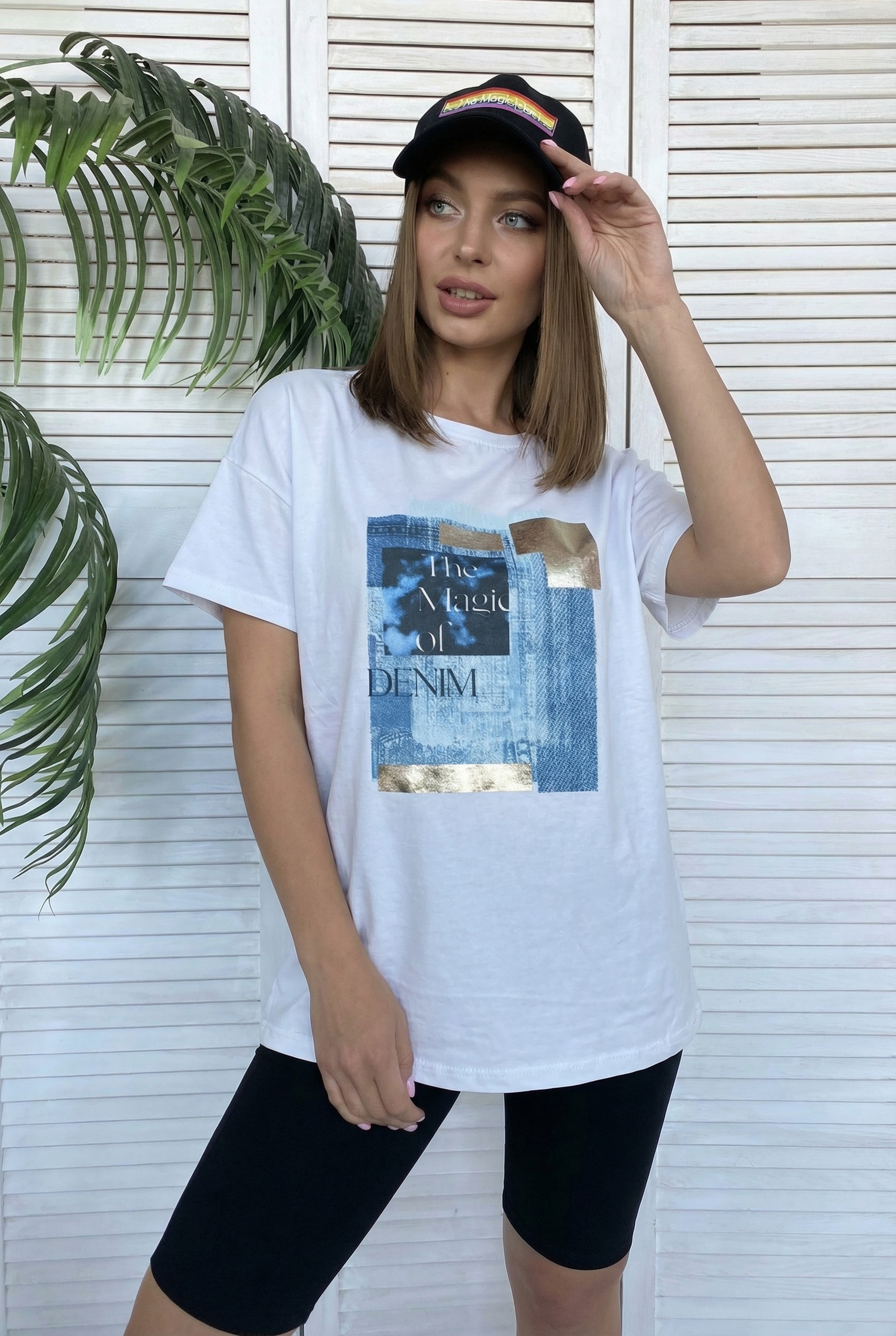 Футболка з стильним принтом — універсальна річ, яка легко впишеться у повсякденний гардероб. Лаконічний дизайн доповнений сучасним графічним принтом у джинсових відтінках із золотистими акцентами, що додає образу модного характеру та робить модель більш виразною. Футболка має комфортний прямий крій, який гарно сідає по фігурі та забезпечує свободу рухів. М’яка та приємна до тіла тканина добре пропускає повітря, тому модель ідеально підходить для теплої пори року. Кругла горловина та класичний короткий рукав роблять цю річ універсальною для створення різних образів — від повсякденних до більш стильних міських луків. Футболка чудово поєднується з джинсами, шортами, спідницями або легкими брюками, дозволяючи створювати безліч модних комбінацій. Характеристики: Принт: декоративний графічний малюнок Рукав: короткий Горловина: кругла Тканина м’яка, еластична та комфортна для щоденного носіння